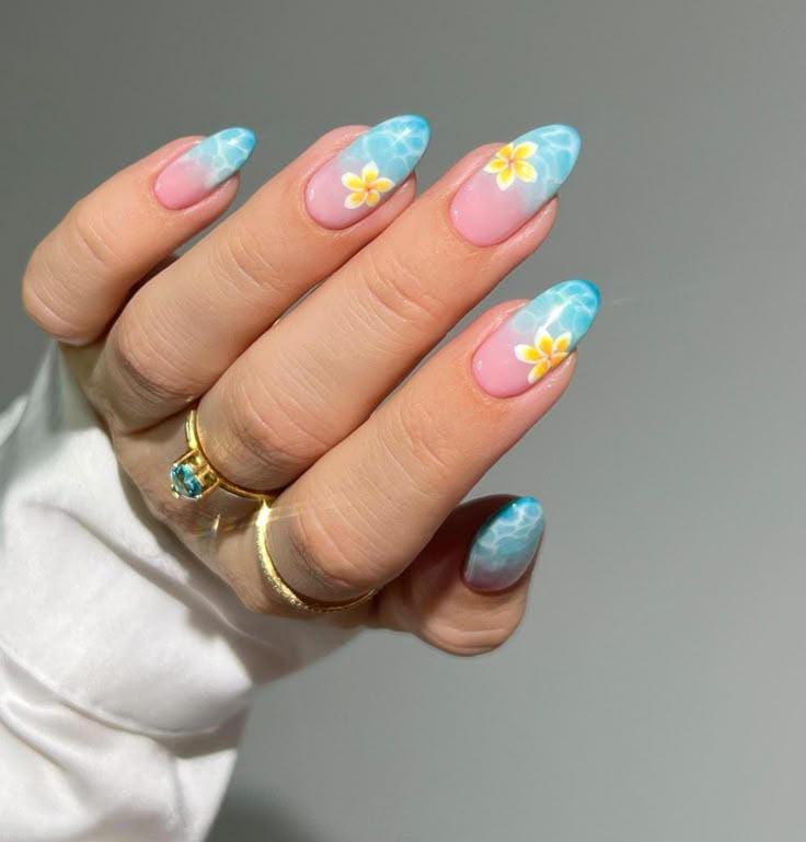 A cool pink-to-aqua ombre blends smoothly into a watery blue tip, finished with simple yellow flower art. The overall vibe is calm and beachy, perfect for a relaxed summer aesthetic.