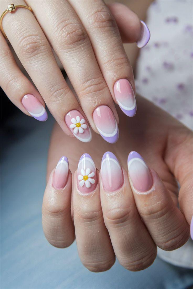 A soft pink base blends into lavender French tips, highlighted with cute white daisy flowers. It feels clean, elegant, and romantic — a subtle summer look with a fresh twist.