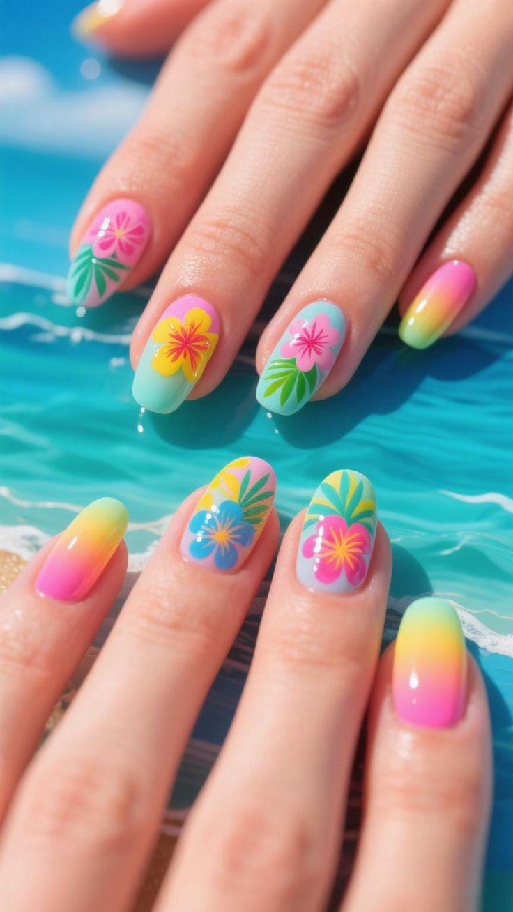 This design blends soft pastel shades like pink, yellow, and blue into a smooth sunset-style ombre. Tropical flowers and leafy accents give it a fresh, beachy summer vibe that feels light and playful.