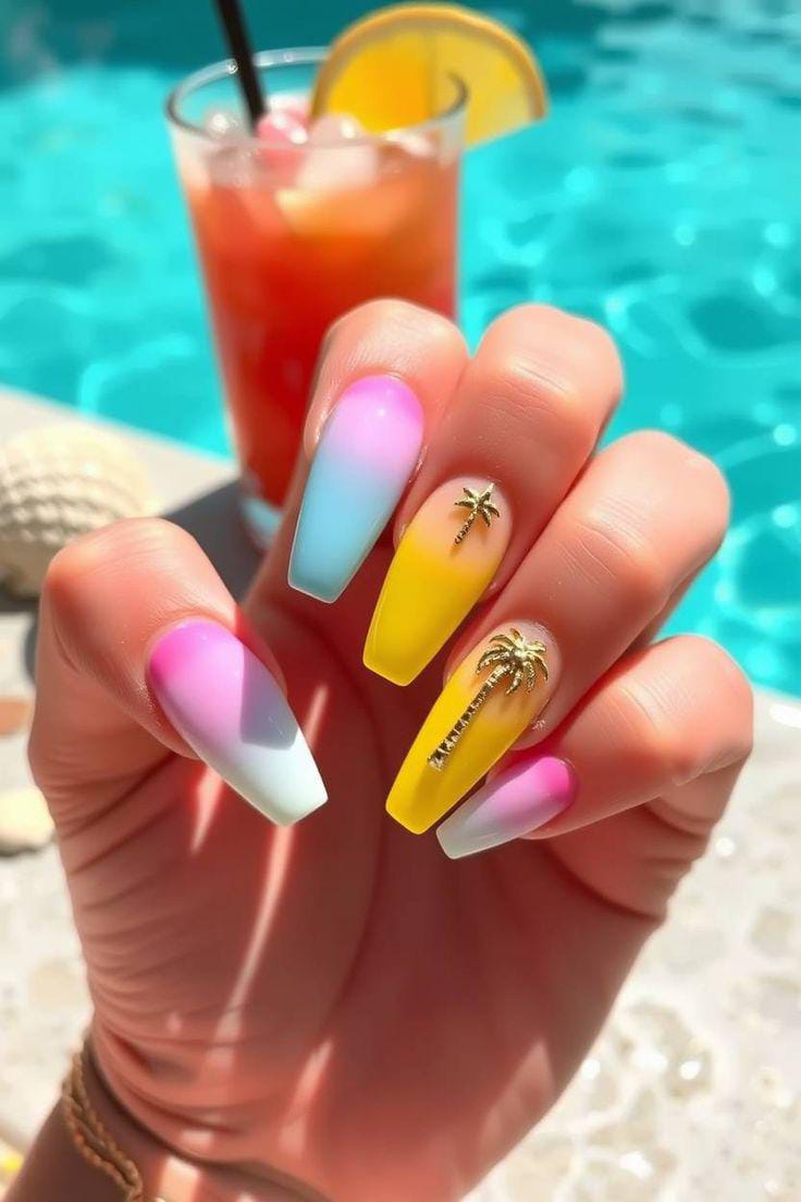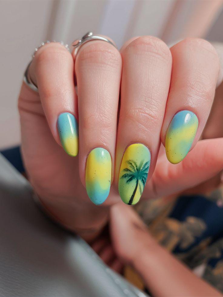 A cool mix of turquoise and sunny yellow fades beautifully across each nail. The subtle palm tree details add a relaxed, vacation-ready feel that screams summer escape.