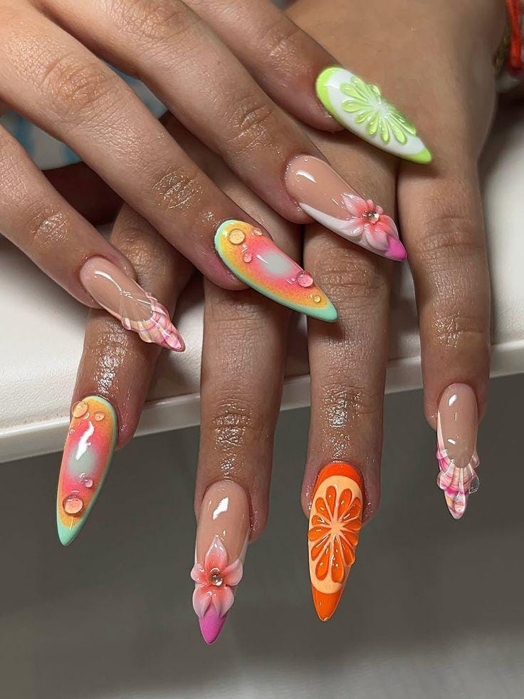 This design mixes nude tip bases with bright ombré shades, fruit slices, and delicate floral details for a fresh summer look. The colors feel juicy and cheerful, giving a fun, artsy vibe that’s perfect for warm-weather days.