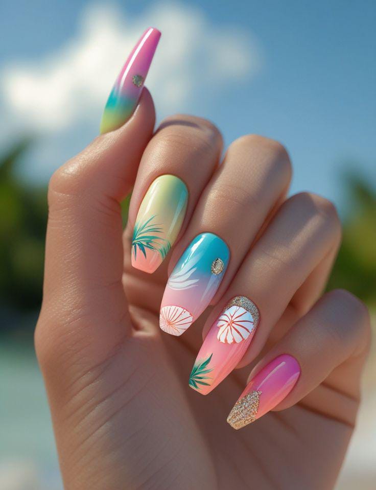 These nails showcase smooth pastel ombré transitions in pink, aqua, mint and peach, finished with subtle shimmer, tropical leaves and shell-inspired accents. The style feels soft, dreamy, and elegant — a calm seaside summer aesthetic with a modern twist.