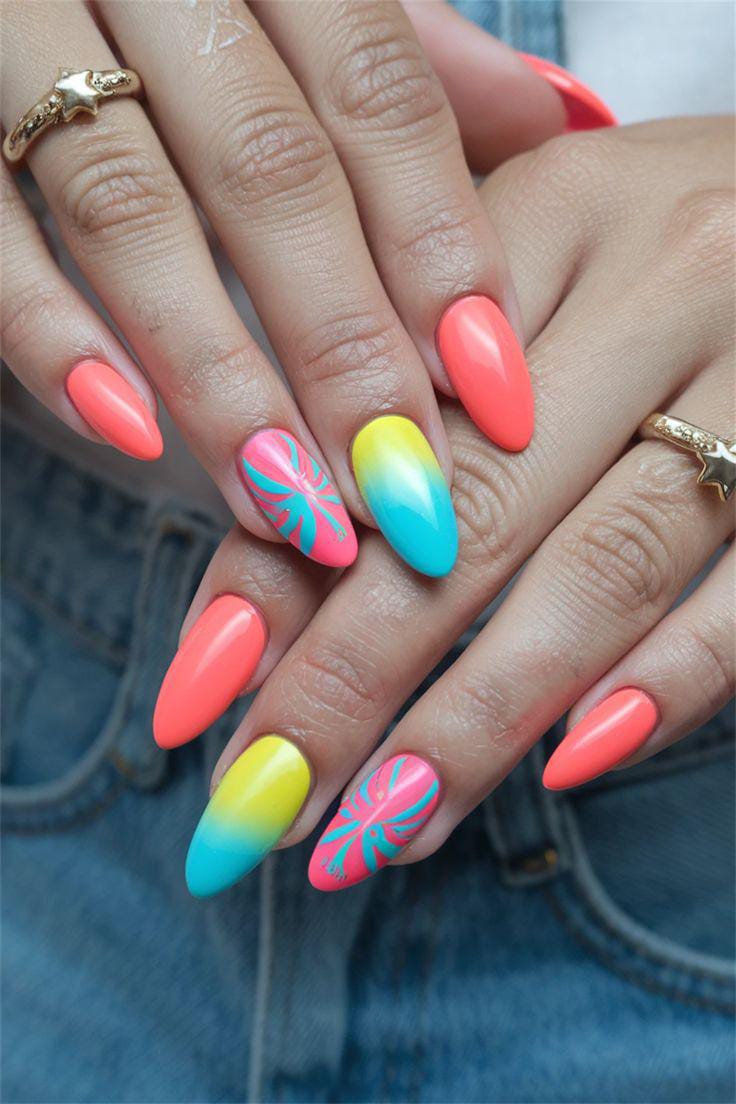 This design features bold summer ombre nails blending coral, yellow, and turquoise tones that feel bright and playful. The mix of smooth gradients with abstract tropical-style accents gives it a fun, beachy energy that’s perfect for summer vacations and sunny days.