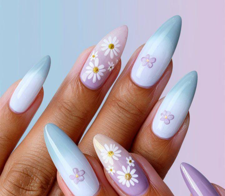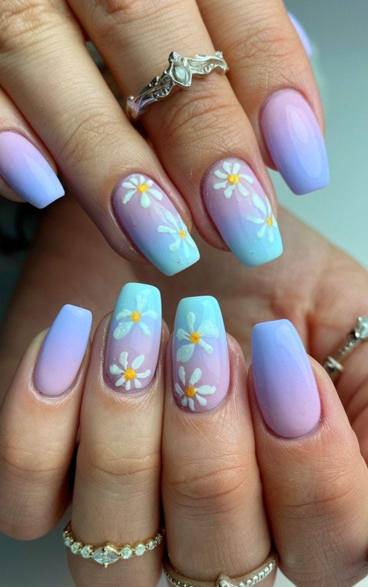 These nails showcase a delicate pastel ombre that fades between soft blue, lavender, and milky white shades. The subtle daisy florals and golden center add a fresh, airy touch, creating a calm, romantic summer look.