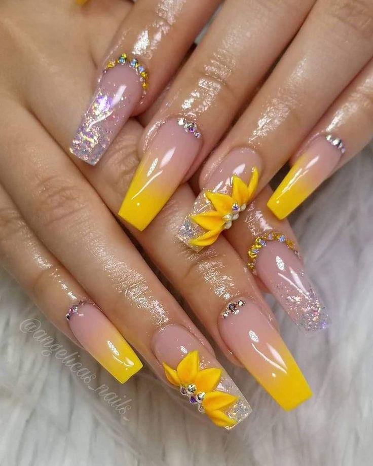 This look features a gentle nude-to-yellow ombre with glossy shine. 3D floral, crystals and subtle shimmer accents bring a bold yet elegant summer glam touch.