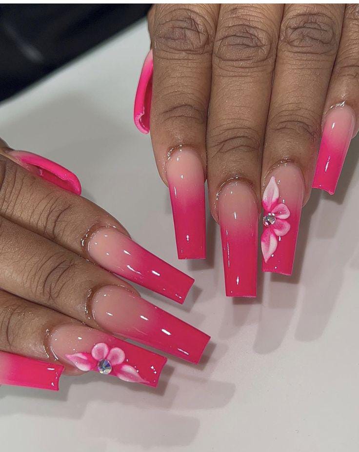 A vibrant glossy pink ombre flows seamlessly from natural nude bases. Minimal floral accents and rhinestones keep the design feminine, bright, and eye-catching summer aesthetic.