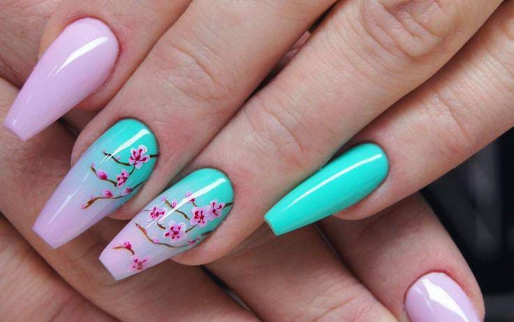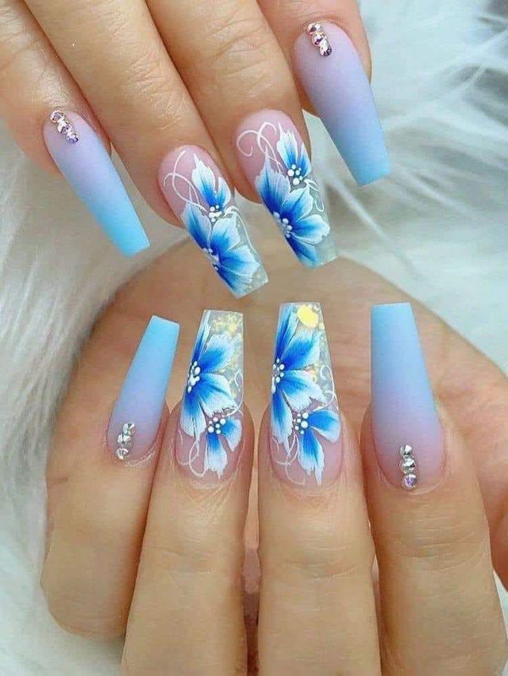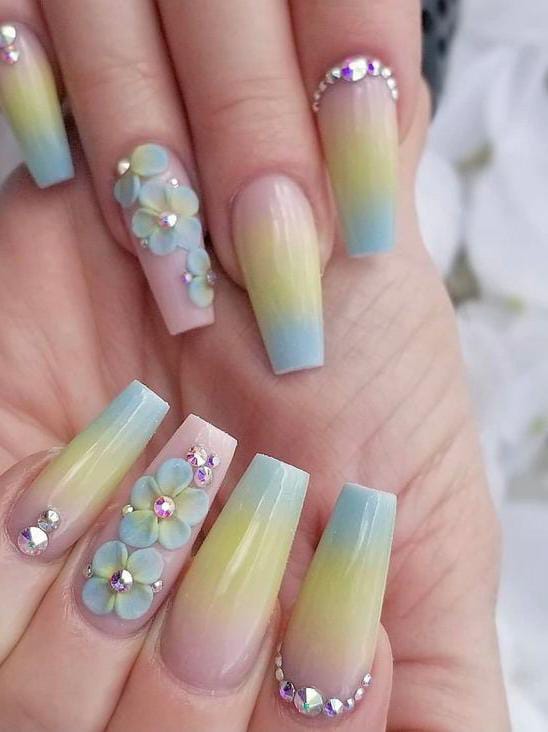 This design features soft pastel ombre tones blending from nude into mint and baby blue, creating a light and airy summer look. Delicate 3D floral accents and subtle rhinestones add a feminine, garden-inspired vibe.