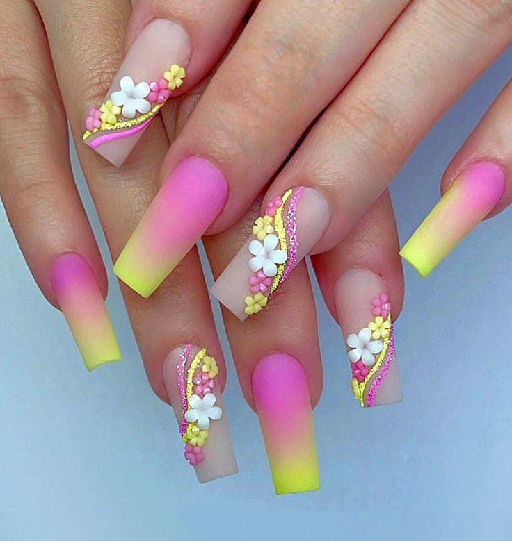 This design features a bright pink-to-yellow ombré that feels bold and sunny. Small 3D floral and glitter swirls on nude accents add a fun, tropical touch, giving the nails a cheerful and beach-ready summer vibe.