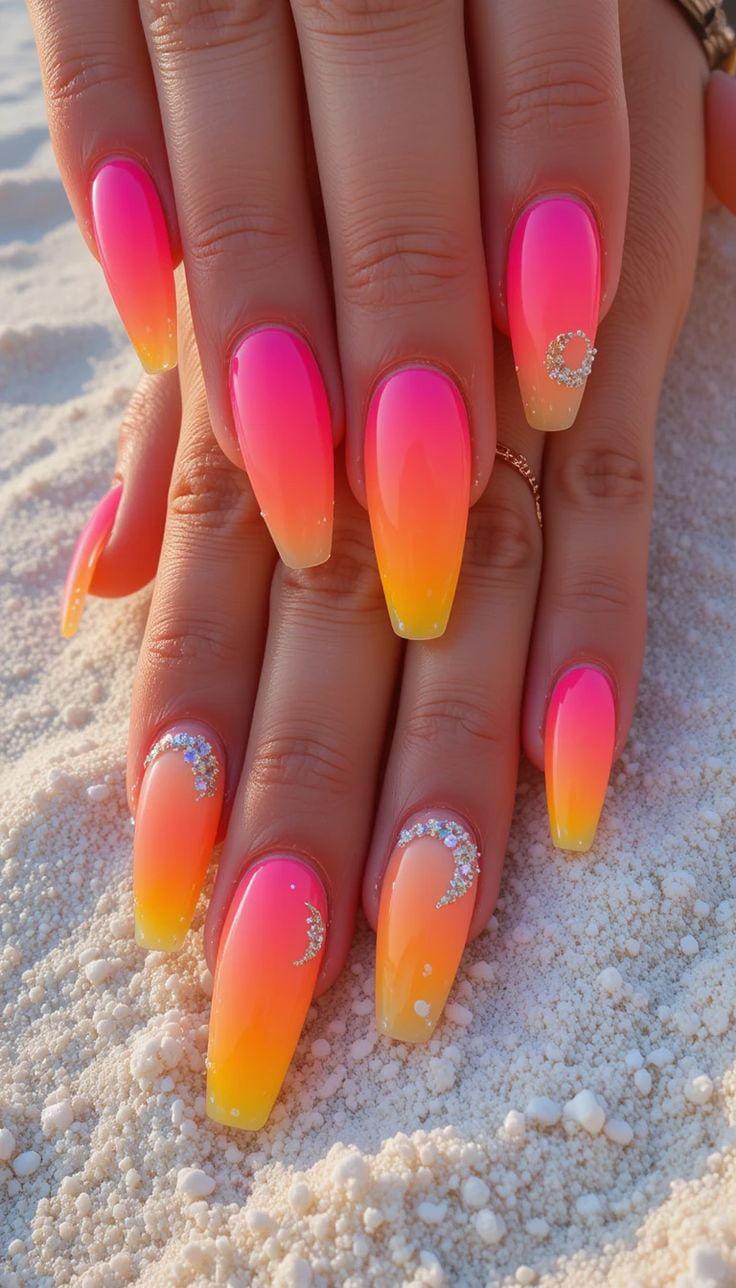 These nails showcase a vibrant pink-to-orange ombré inspired by summer sunsets. Subtle rhinestone accents add a hint of sparkle without overpowering the warm, glowing color blend.