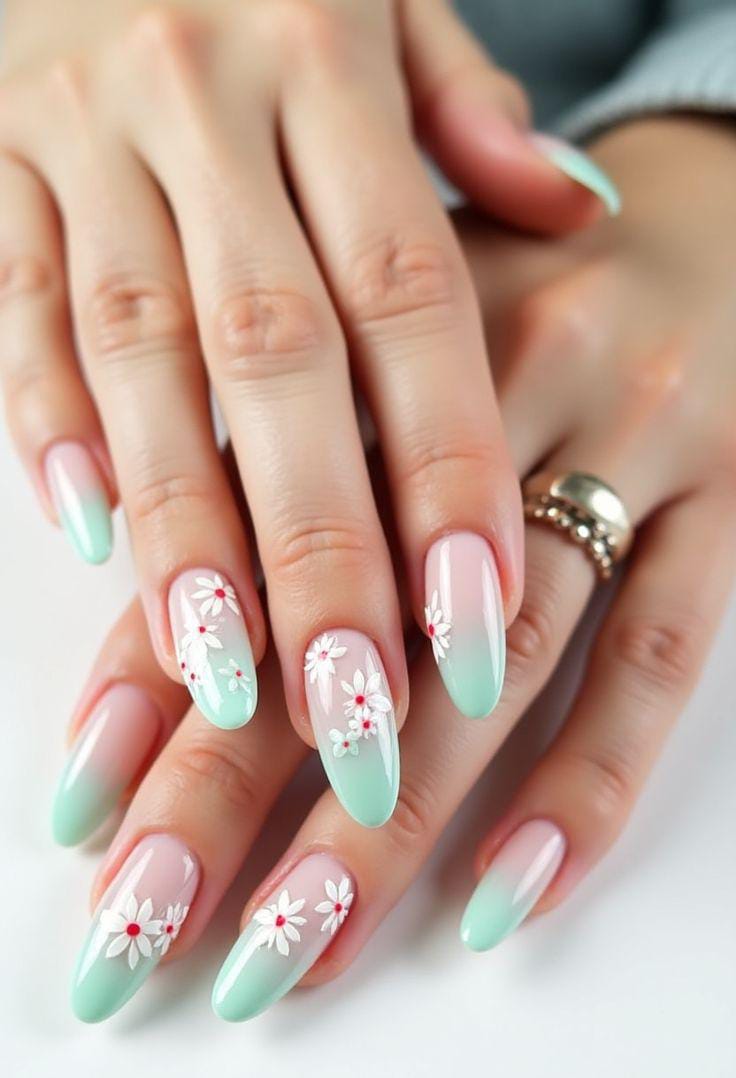 A fresh mint-green ombré fades gently into a natural nude base. Simple white floral and red center details give the design a clean, refreshing feel that’s perfect for daytime summer looks.