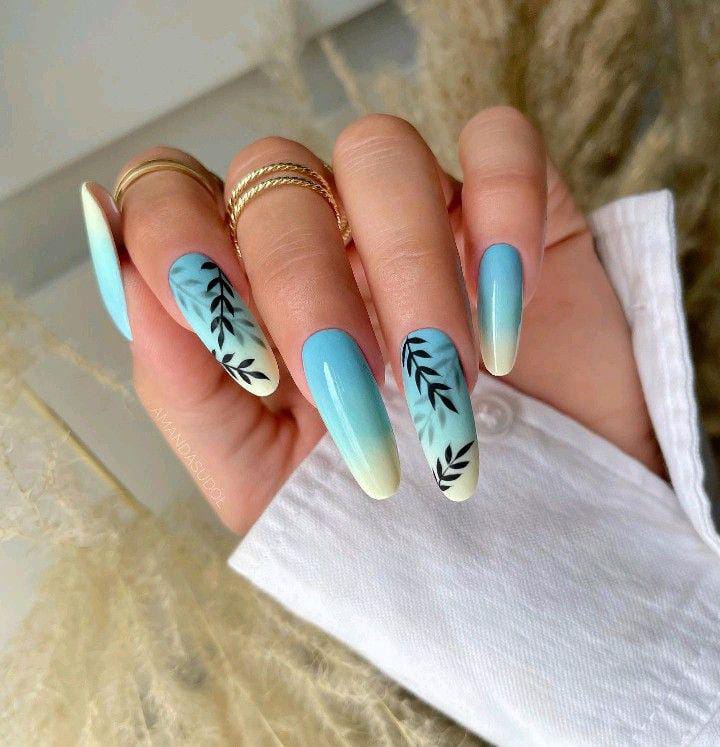 This look combines cool blue-to-cream ombre with simple black leaf designs for a tropical feel. The overall style is calm, fresh, and modern — great for beachy summer moods.