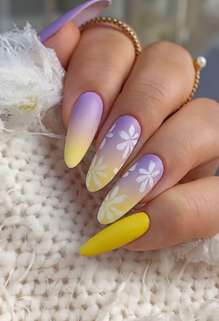 This design combines soft lavender and yellow in a smooth pastel ombré. White floral silhouettes enhance the dreamy, delicate vibe, making the nails feel light and elegant.