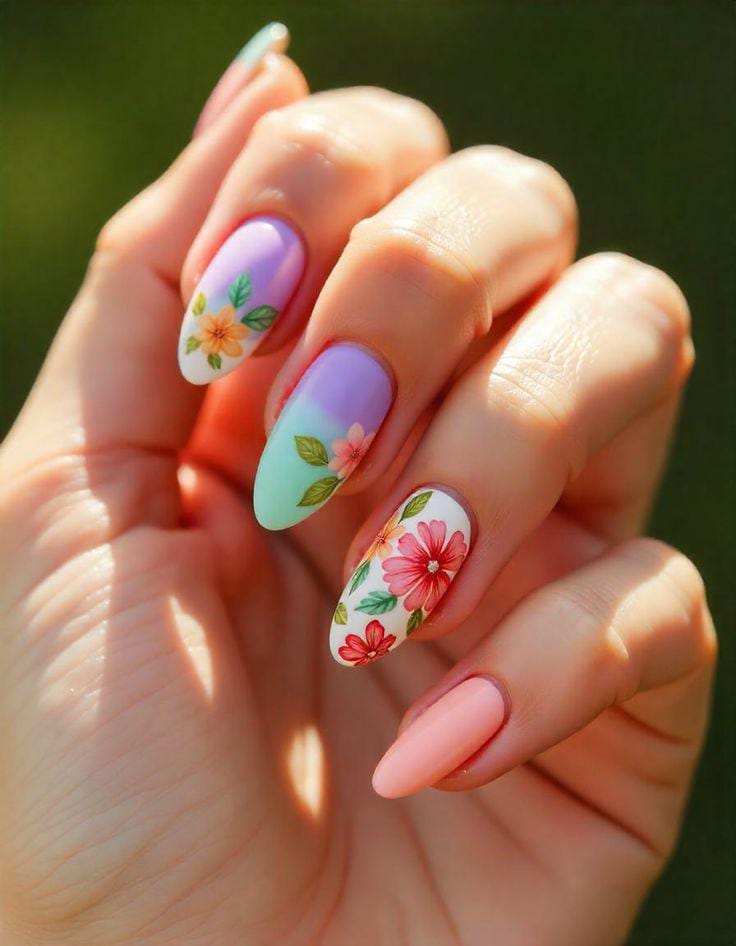 This design blends soft pastel shades like lavender, mint, white and peach into a gentle ombre base. Delicate floral accents add a fresh, spring-to-summer garden vibe that feels light and feminine.