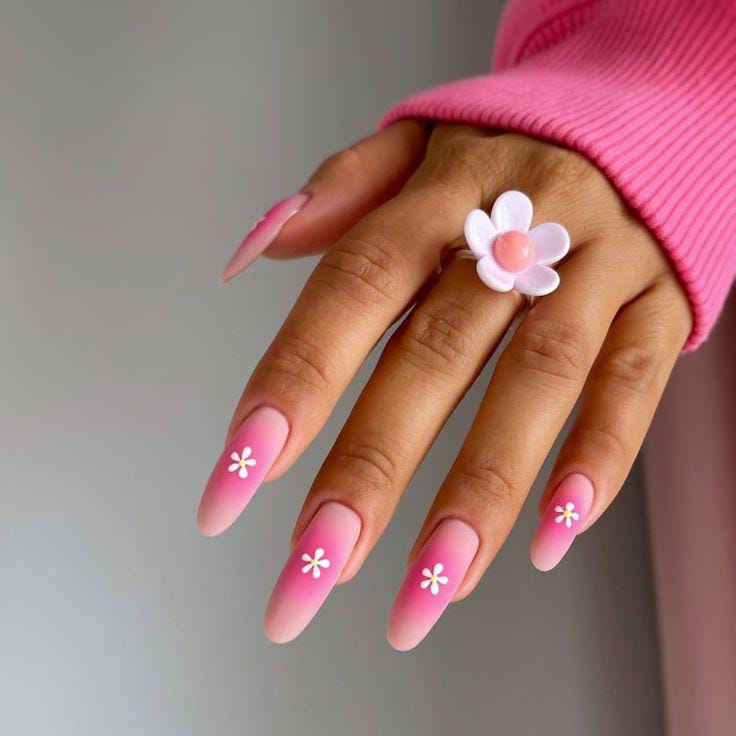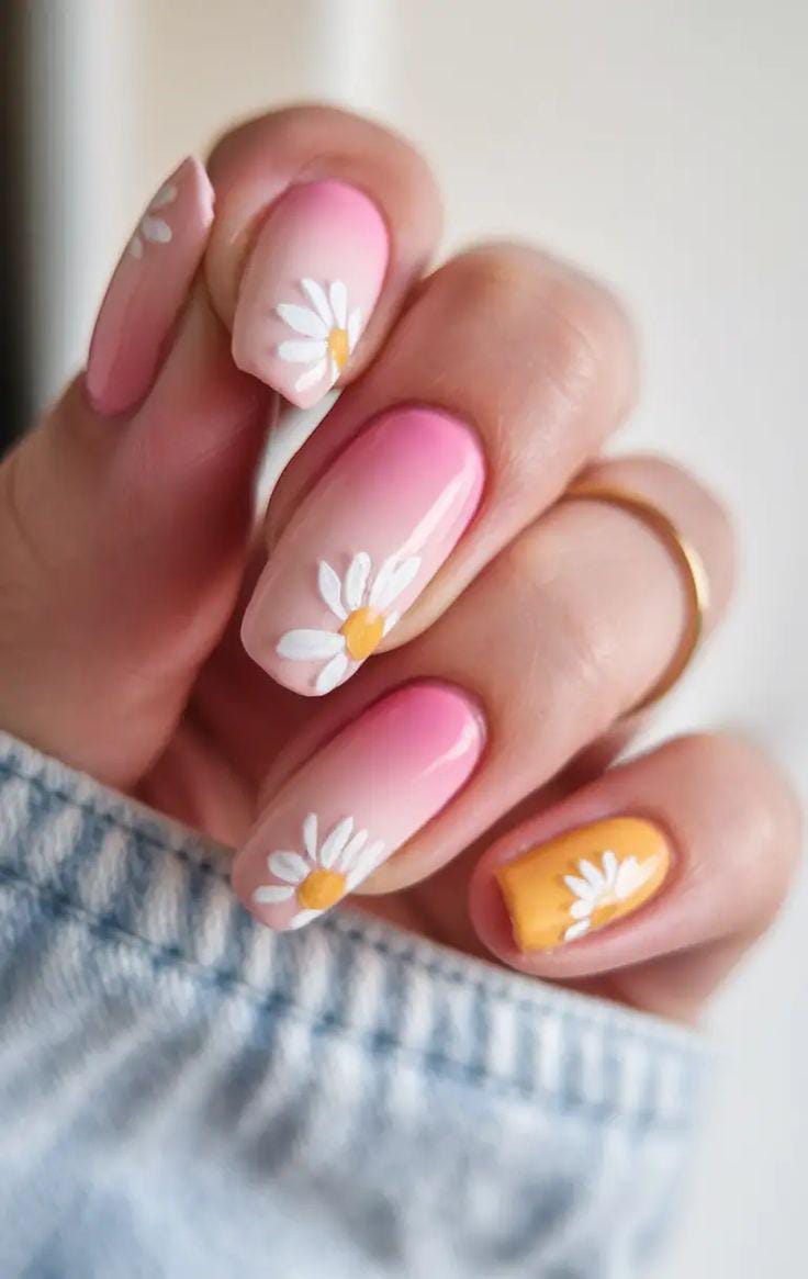 This soft pink ombre fades seamlessly into a nude base, giving the nails a clean and airy feel. White daisy flowers and a pop of yellow add a happy, carefree summer touch.