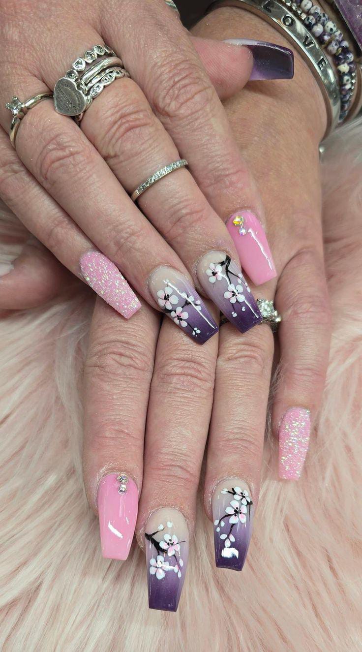 A dramatic purple-to-nude ombre gives this set a slightly bolder summer look. Hand-painted floral branches, gemstone and subtle glitter accents add elegance while still feeling seasonal.