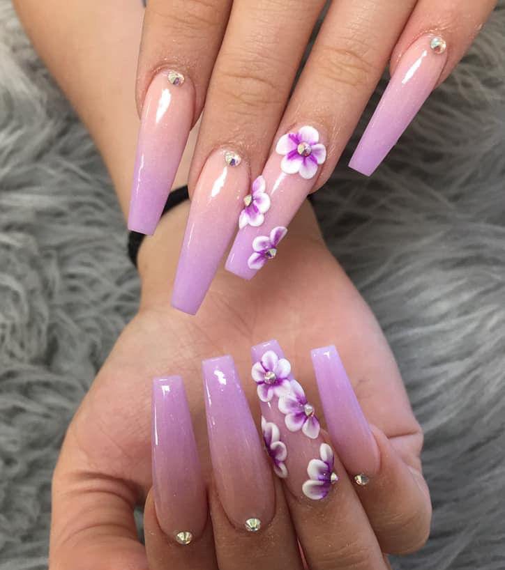 This look combines a smooth lilac to nude ombre with glossy finishes for a clean and polished appearance. Raised floral accents and small crystals bring a touch of elegance while keeping the overall style light and summery.