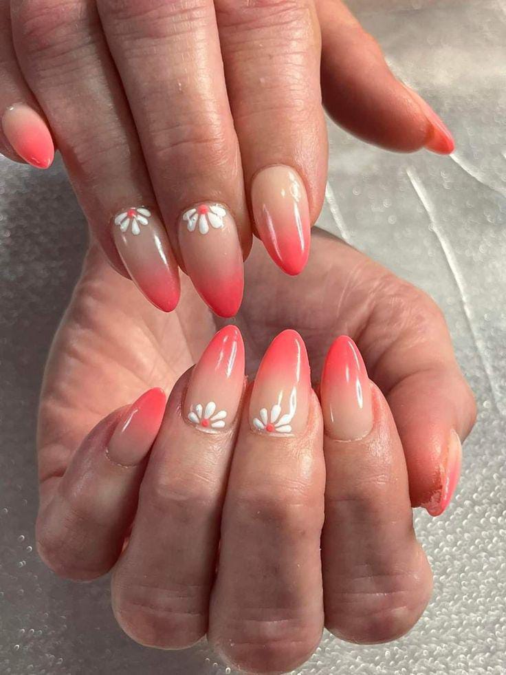 A warm coral ombre fades softly into nude bases, finished with tiny white daisy details. The design feels bright, feminine, and sunny, giving strong summer sunset energy.