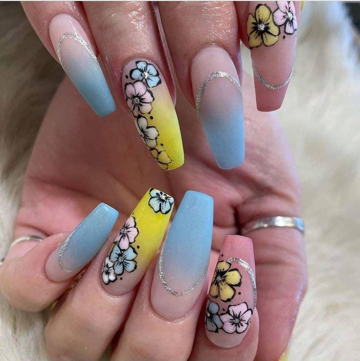 Pastel blue, yellow, and pink tones blend together in a soft sunset-style ombre. Black-outlined floral art and fine glitter curved line nude accents add contrast and detail, giving the design a modern yet artistic summer vibe.