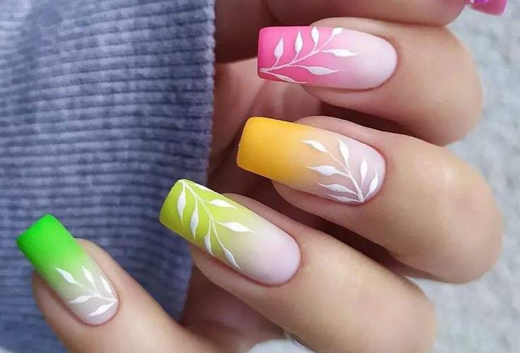 Bright summer shades fade into a pink, yellow, green and nude base, with white leaf accents adding a tropical touch. The colorful ombre gives this set a bold, playful energy while still feeling clean and stylish.