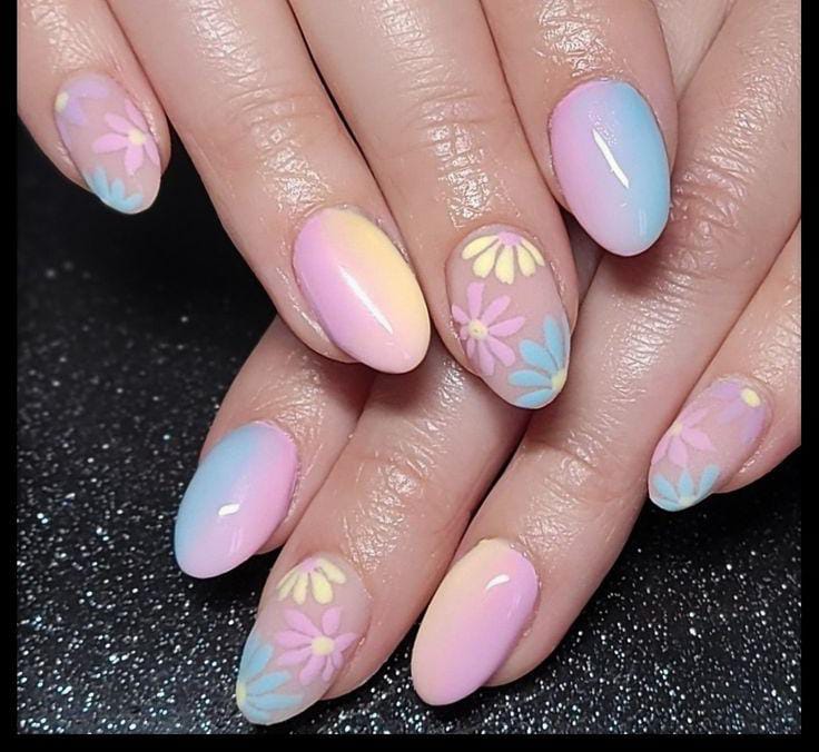 Muted pastel tones in blue, yellow and pink blend beautifully across the nails, paired with soft floral patterns on nude accent nails. The overall style is calm, dreamy, and perfect for a subtle spring-to-summer transition.