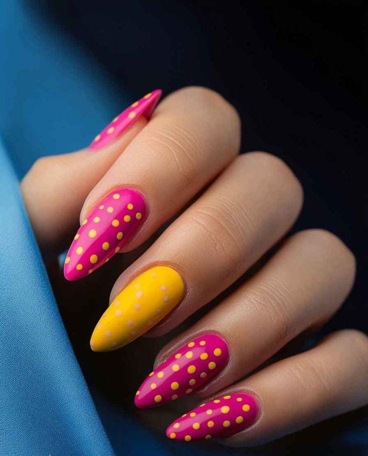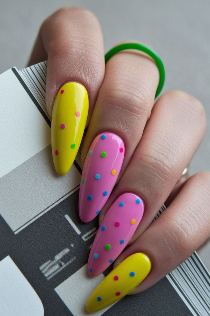 Bold pink and bright yellow nails instantly stand out with their vibrant summer energy. The colorful polka dots scattered across each nail give it a lively, party-ready finish.