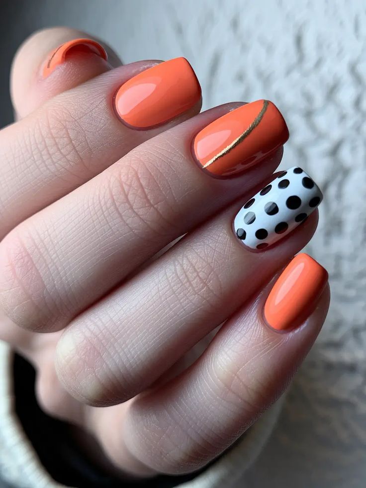 A vibrant orange manicure paired with a white accent nail covered in bold black polka dots creates a fun, retro summer vibe. The glossy finish and playful contrast make it feel bright, fresh, and eye-catching.