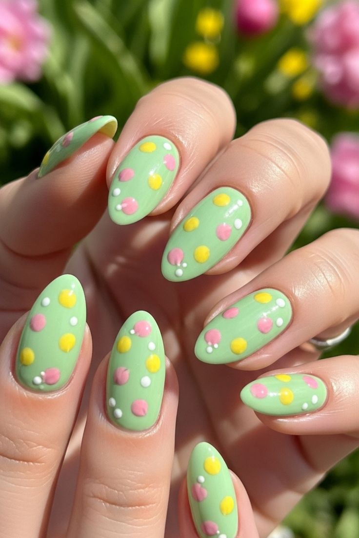 Soft mint green nails sprinkled with pastel pink, yellow, and white dots create a sweet, spring-to-summer look. The overall vibe is light, cheerful, and delicately playful.