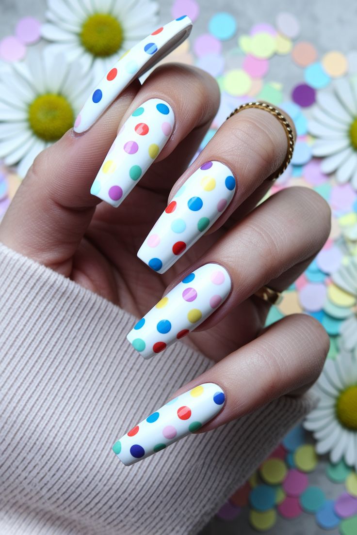 Long white nails covered in multicolored polka dots create a festive, confetti-inspired design. The look is fun, bold, and full of carefree summer energy.