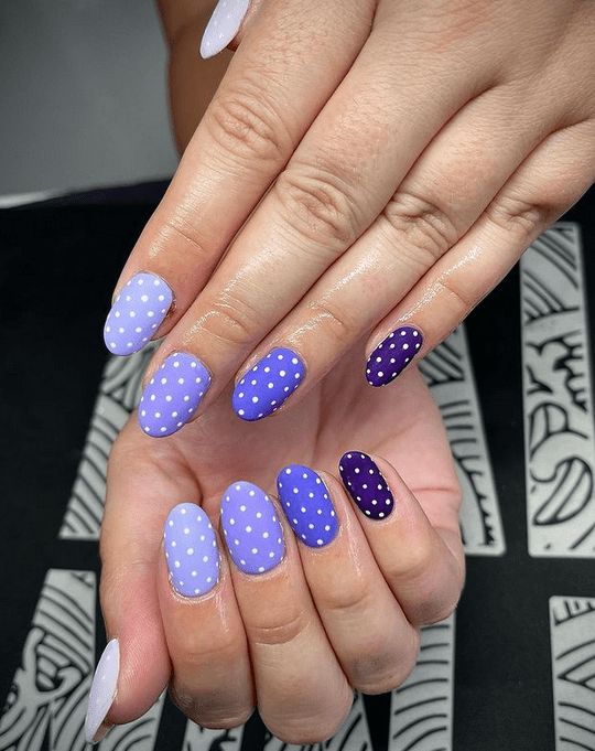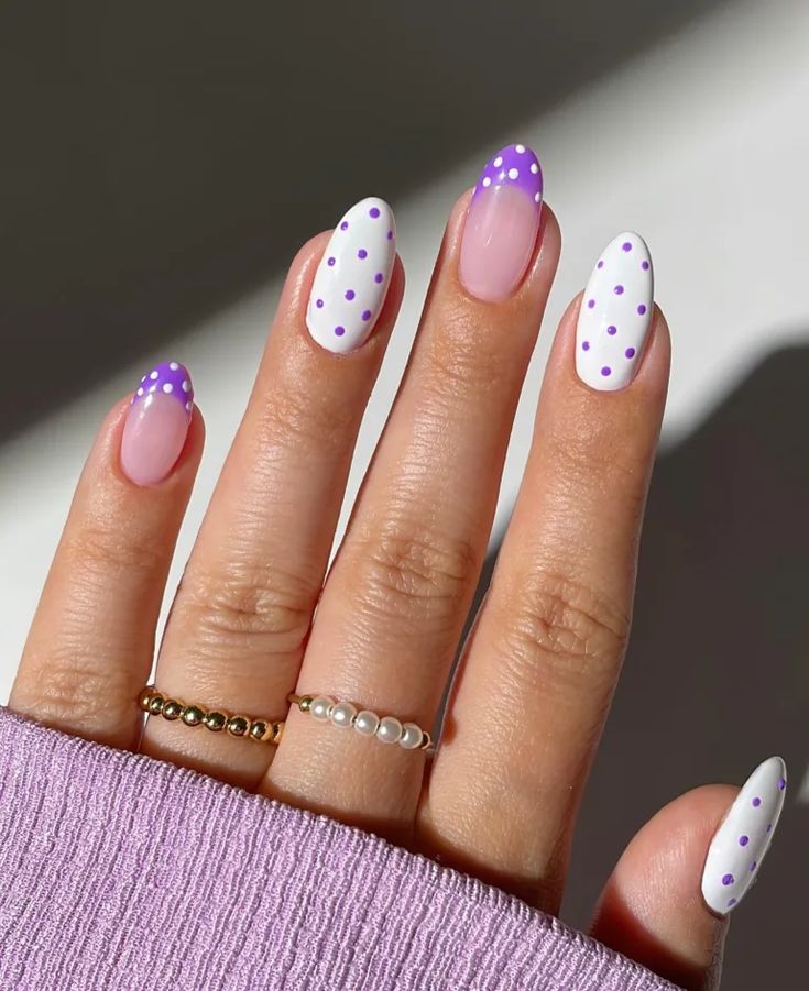 Soft lavender and deep purple nails are paired with tiny white polka dots for a playful yet clean summer look. The alternating shades add contrast while keeping the vibe light and sweet.