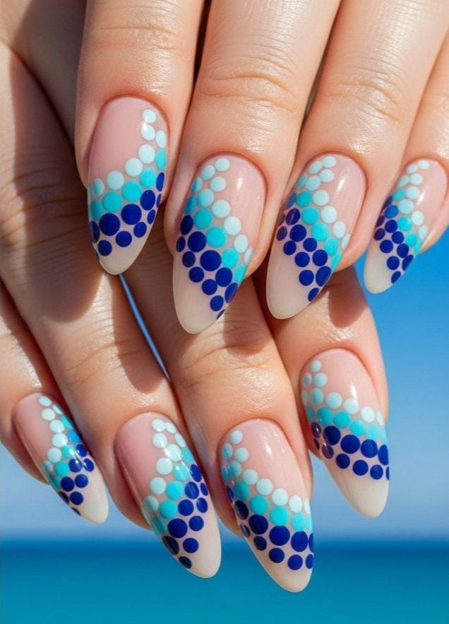 This design features a nude base with layered blue and turquoise dots sweeping diagonally across the nails. The cool tones and flowing pattern give it a fresh, beachy summer feel.