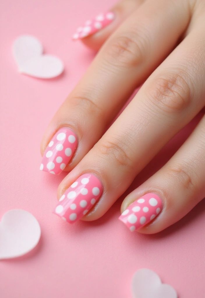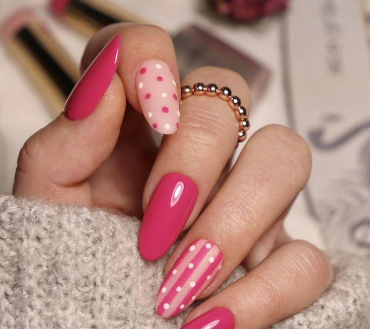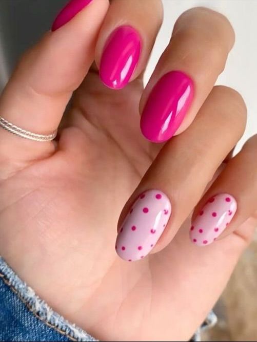 A bold hot pink manicure is paired with soft blush accent nails covered in sweet white and pink polka dots. It feels flirty, vibrant, and perfect for a bright summer look.