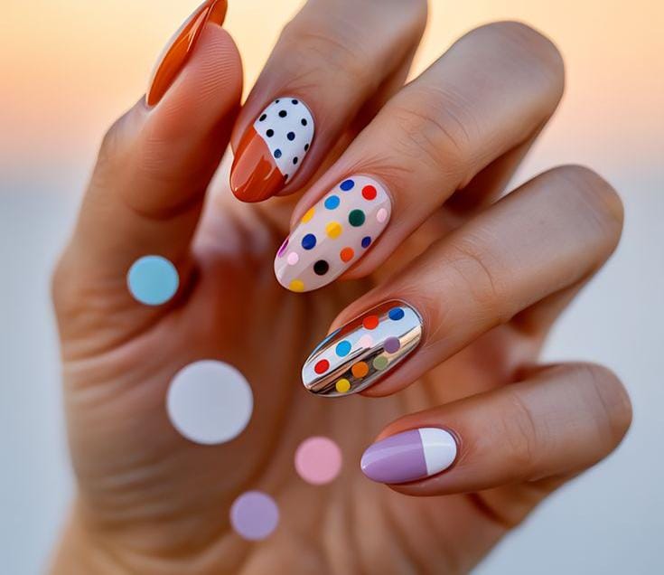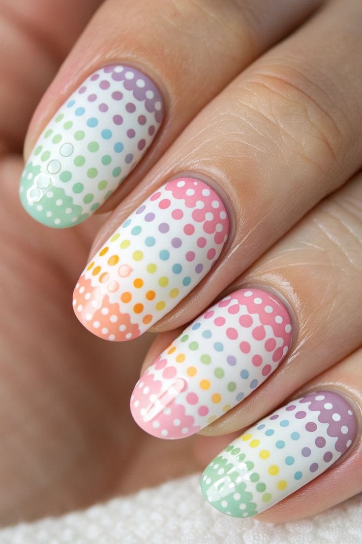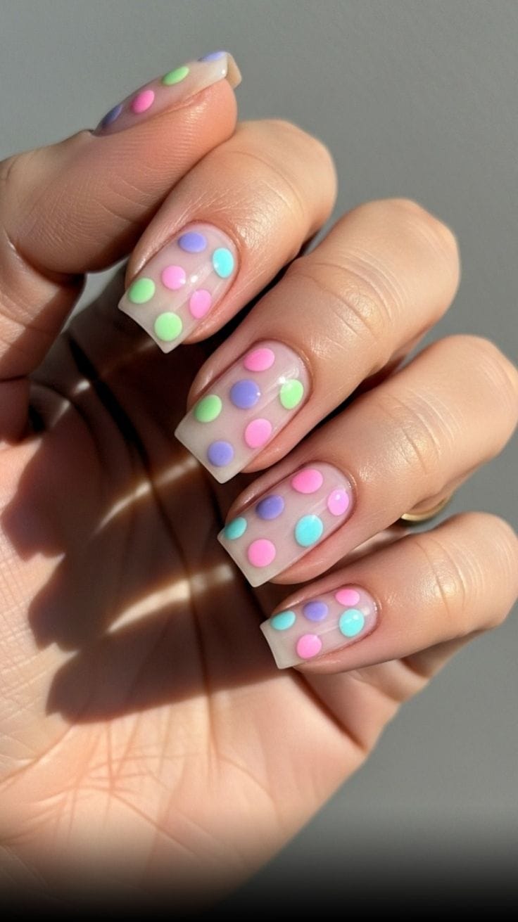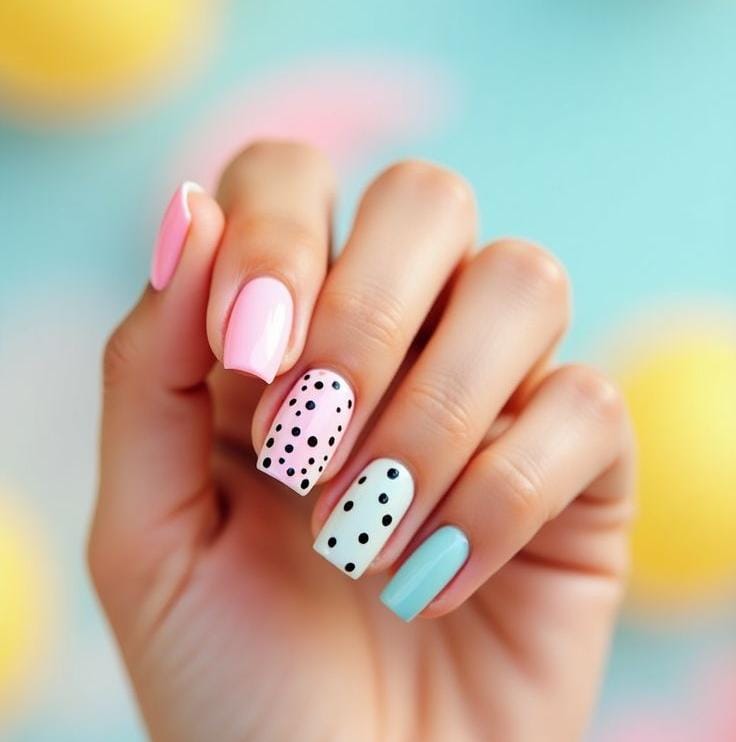 Each nail features a different pastel shade topped with white polka dots for a cheerful, mix-and-match effect. The design feels fun, youthful, and full of summer energy.