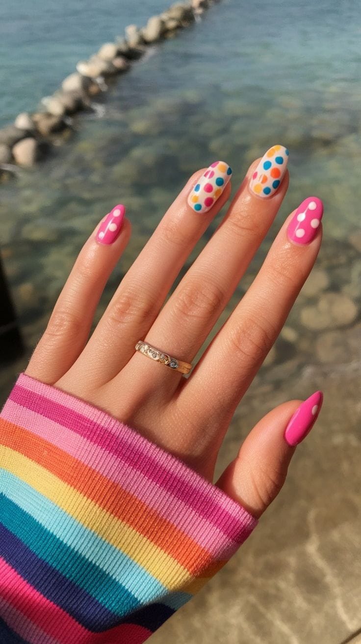 Bright pink and creamy white nails decorated with multicolored polka dots give off a cheerful, beachy vibe. It’s fresh, youthful, and perfect for sunny summer days.
