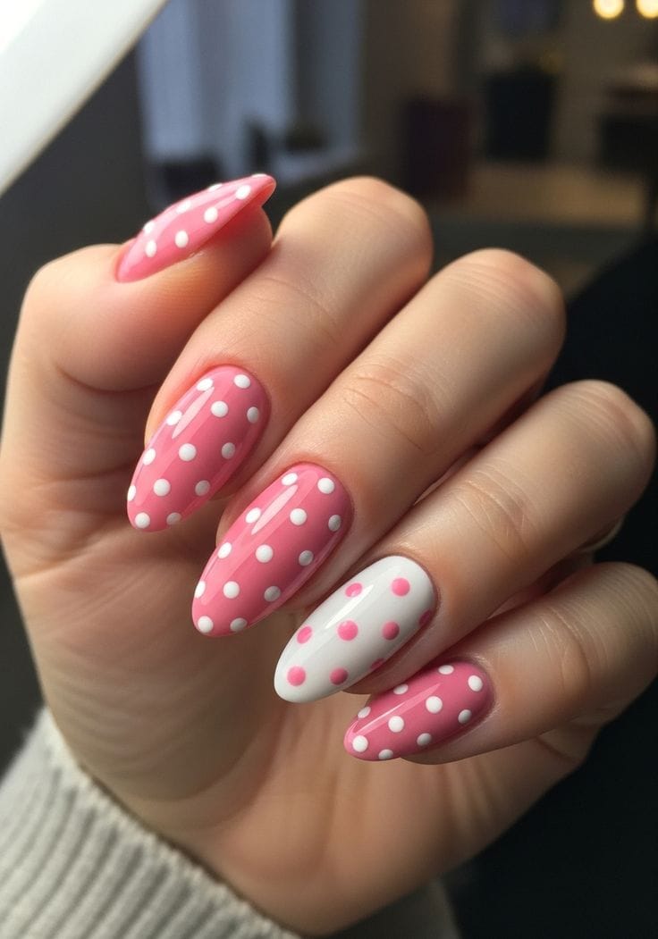 A glossy pink and white manicure featuring classic white polka dots with a playful accent nail. The almond shape and sweet color combo give it a fresh, flirty summer vibe.