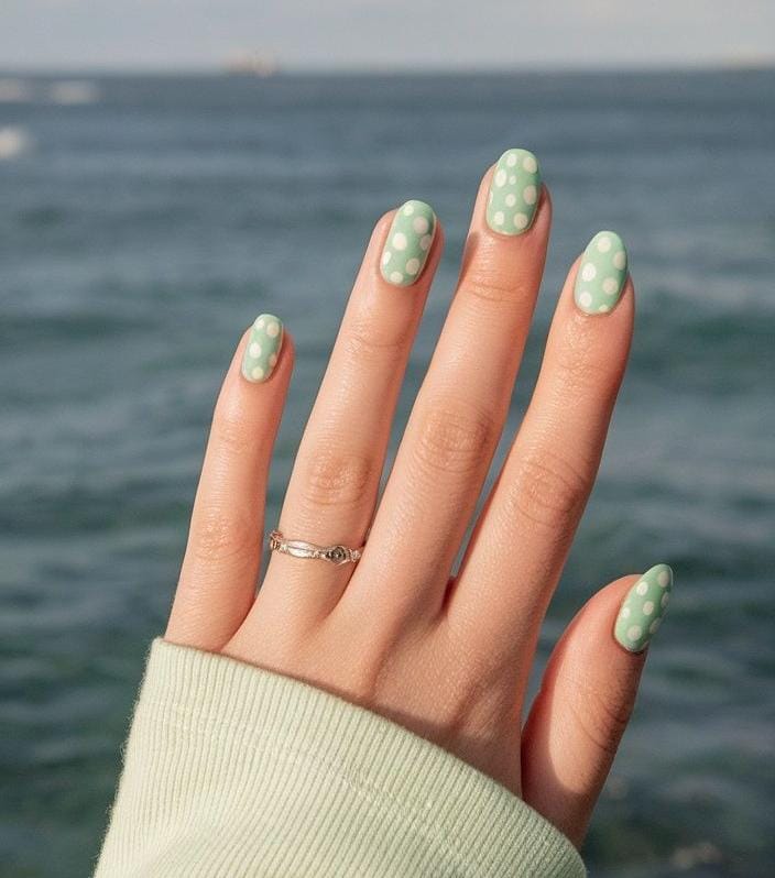 Soft mint green nails covered in delicate white polka dots create a light and airy seaside feel. The simple pattern and pastel tone make it perfect for a calm, beachy summer look.
