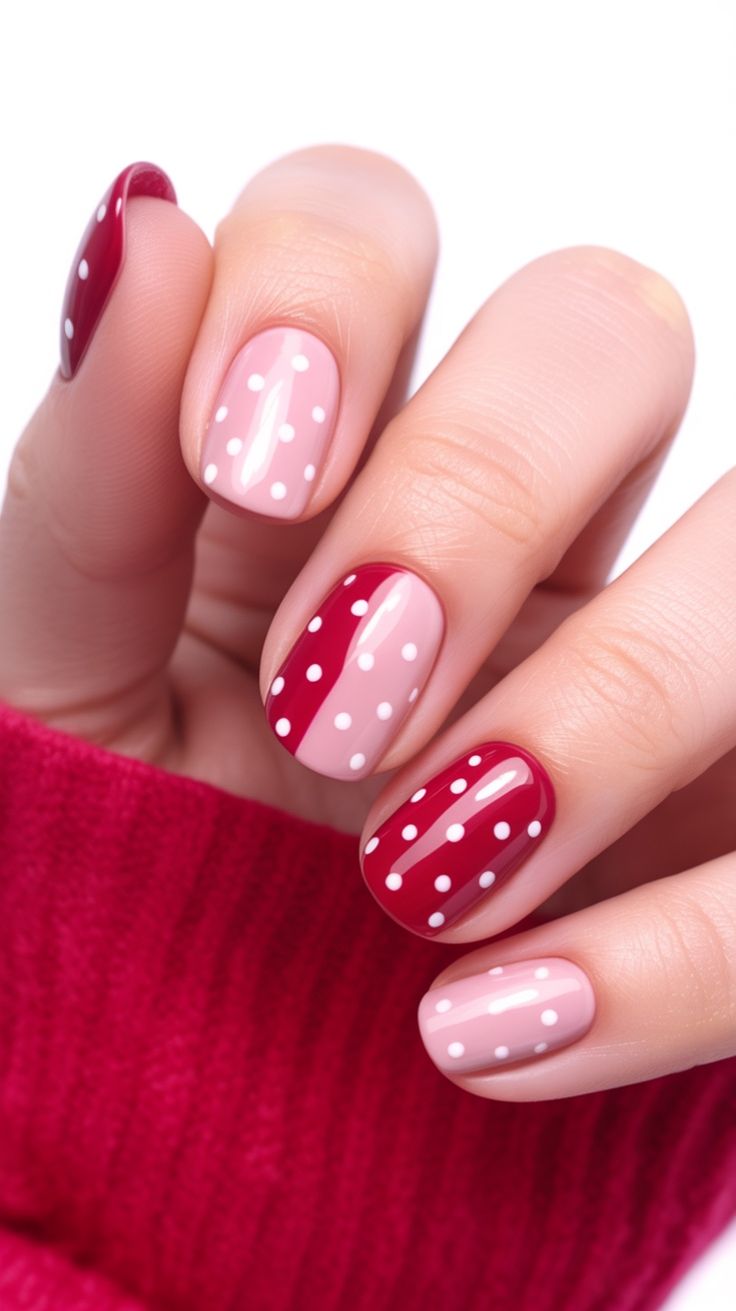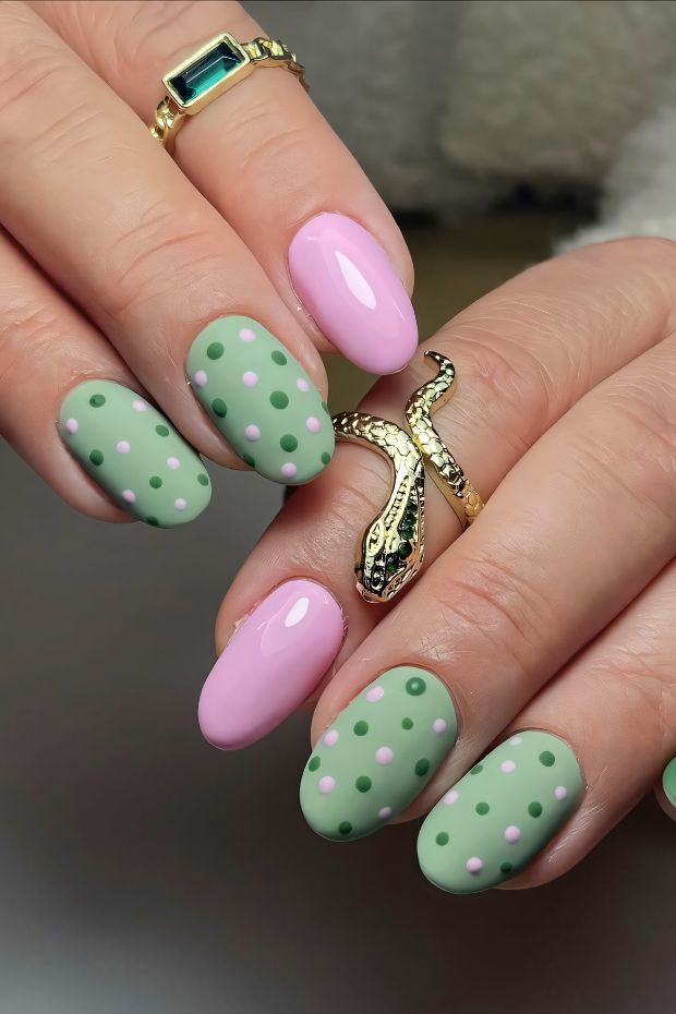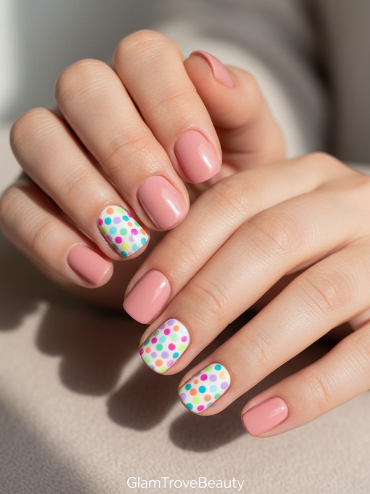 A blush pink manicure paired with colorful polka dot accent nails for a fun twist. The mix of soft nude tones and bright dots feels cheerful and youthful.