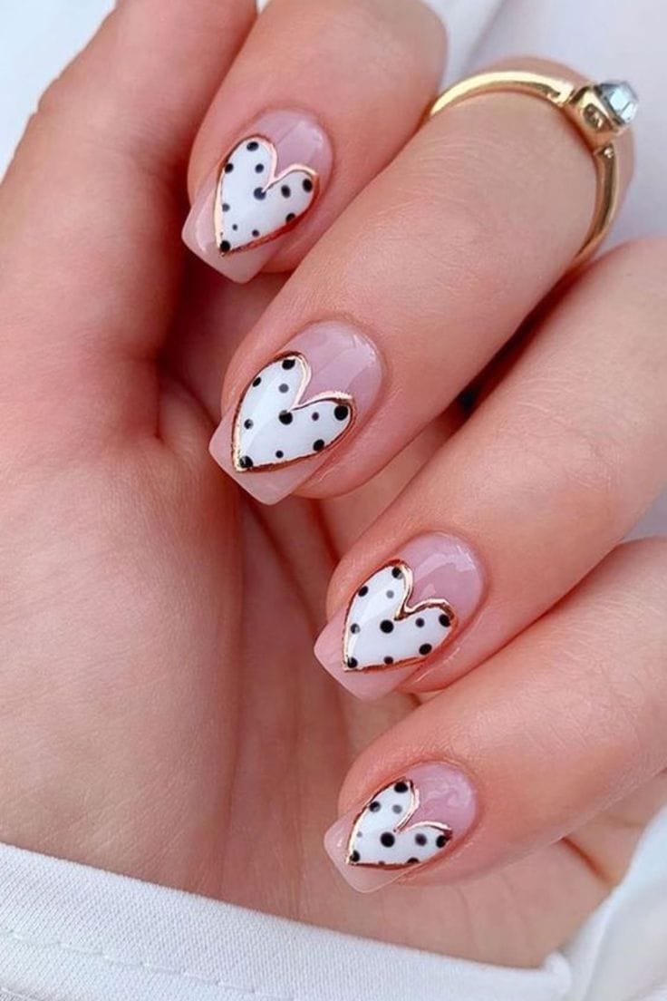 Sheer nude nails are decorated with white heart shapes filled with tiny black polka dots and outlined in gold. The design is cute and romantic with a chic, modern twist.