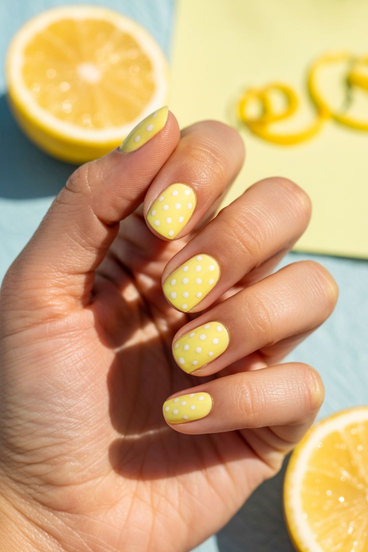 Soft yellow nails with crisp white polka dots create a bright, cheerful summer look that feels fresh and playful. The overall vibe is light, sunny, and effortlessly cute.