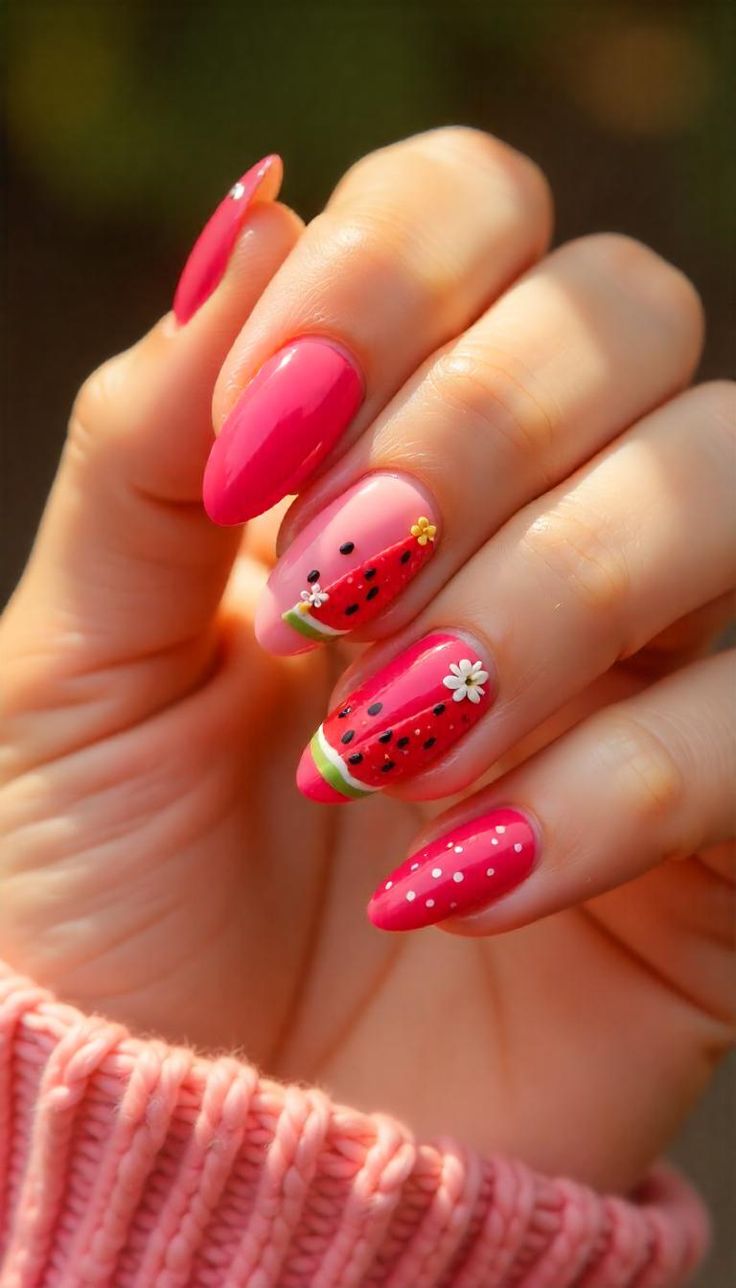 Bold pink nails with watermelon-inspired accents and tiny polka dots give off a juicy, summery vibe. The look is playful, colorful, and full of seasonal charm.