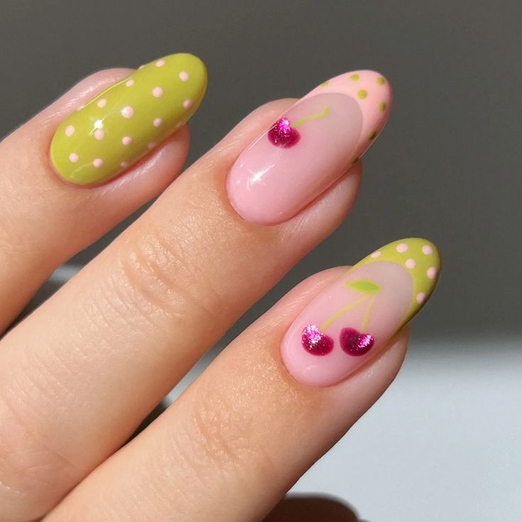 Soft pink and lime-green nails are paired with playful polka dots and cute cherry accents. The vibe is sweet, youthful, and perfect for a fun summer mood.