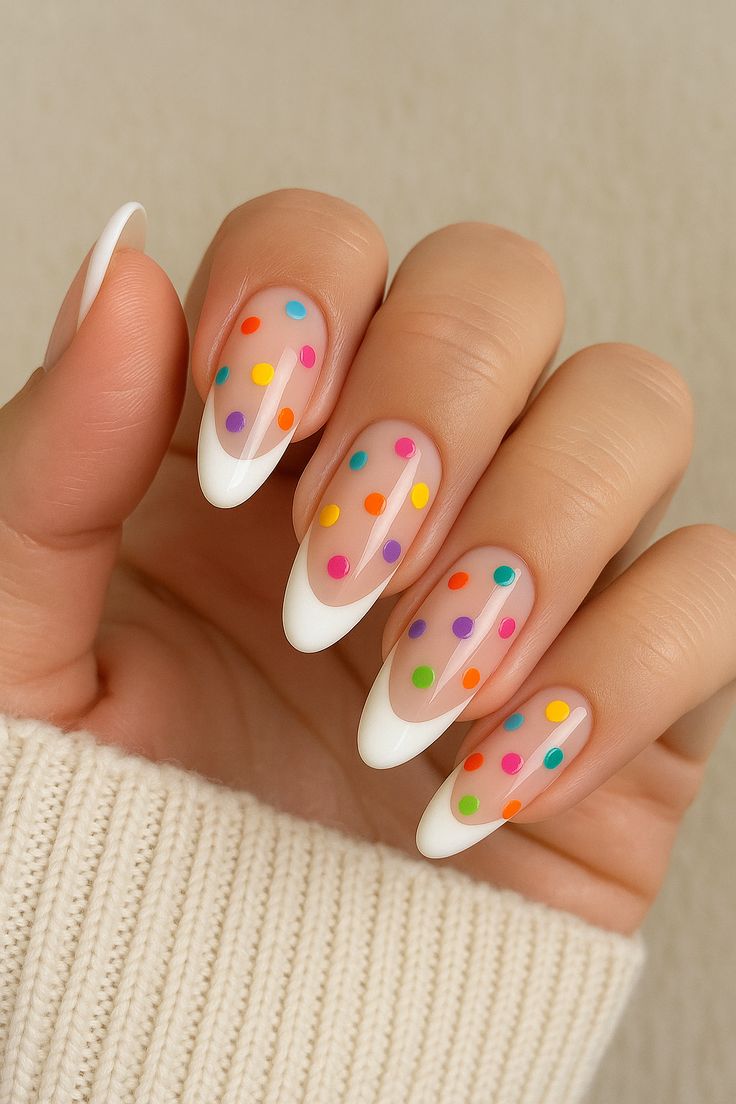 Classic white French tips are mixed with sheer bases and colorful polka dots for a light, playful twist. The overall look is bright, cheerful, and airy.