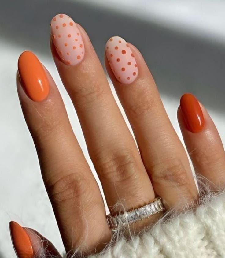 Warm orange nails are combined with blush pink polka-dotted accents for a cozy yet summery feel. This design feels bold, fun, and slightly retro.