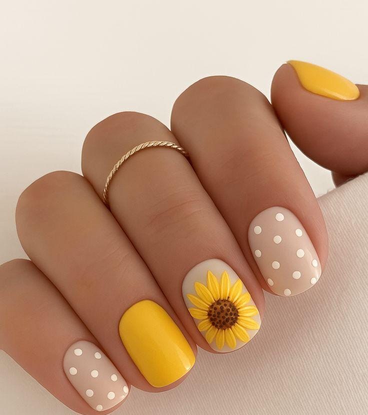 This cheerful set combines solid yellow nails with soft beige nails topped with delicate white polka dots and a sunflower accent. The bright colors and playful pattern create a fresh, sunny summer feel.
