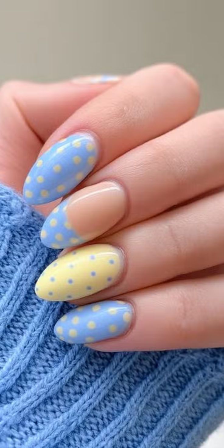 Light blue and buttery yellow nails with delicate dots give off a cheerful, airy summer feel. The design is playful yet gentle, perfect for warm-weather days.