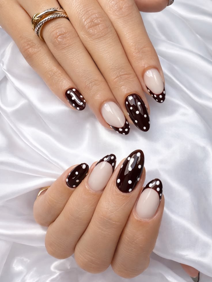 Glossy brown and nude nails feature crisp white polka dots for a bold yet elegant contrast. The design feels modern, stylish, and slightly retro.