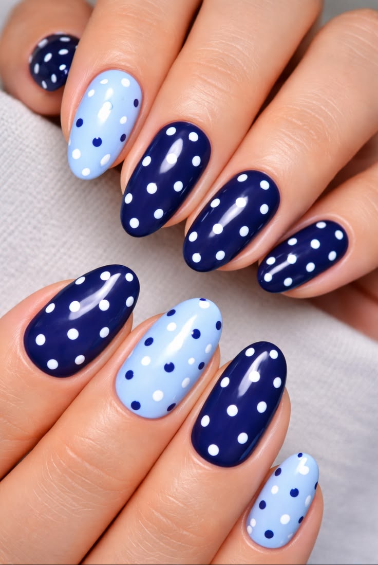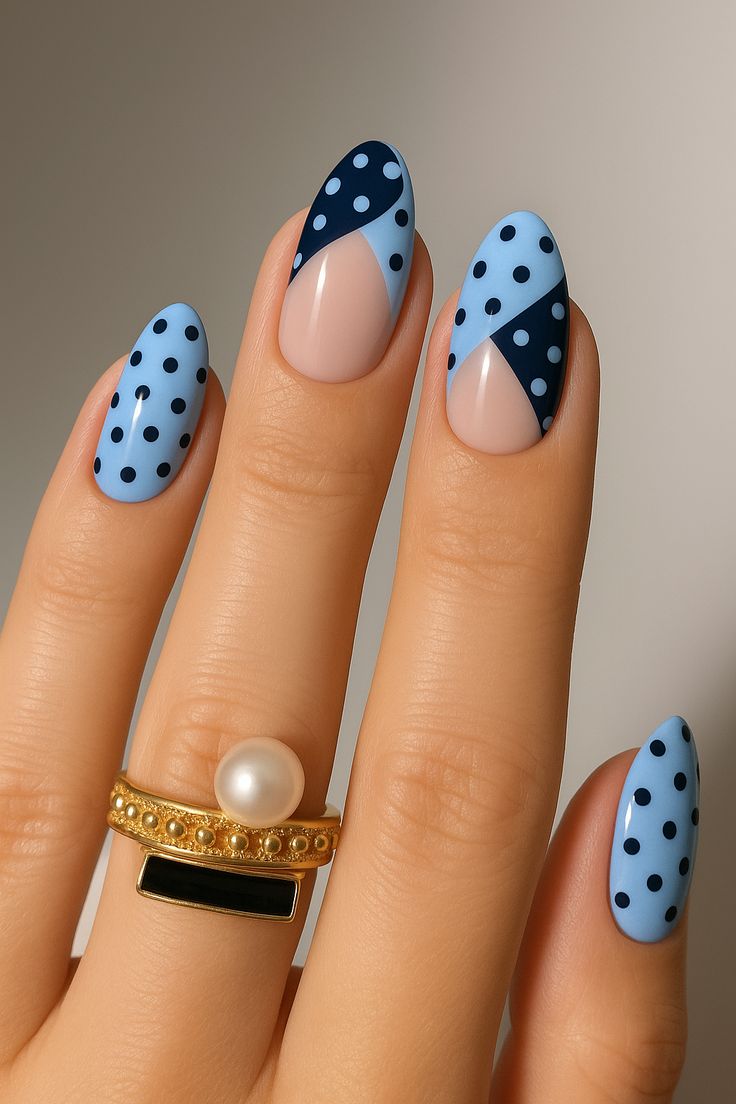 Deep navy and soft sky-blue nails are paired with classic white polka dots for a cool summer vibe. The mix feels clean, cheerful, and refreshing.