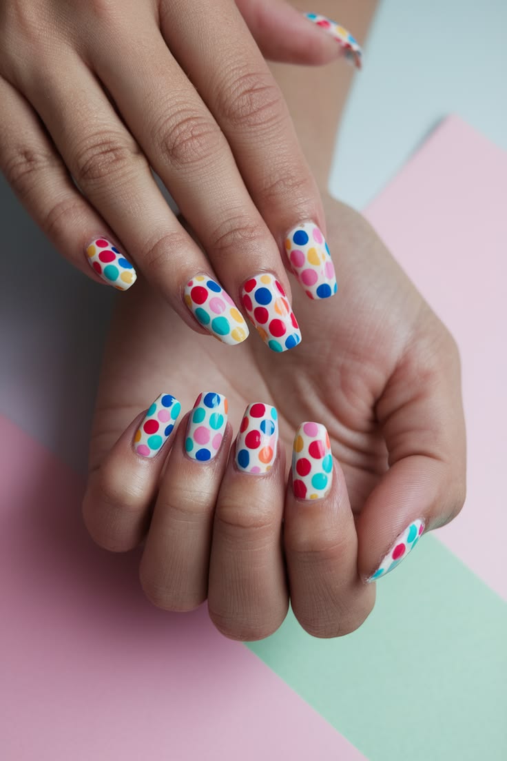 A milky pink base is topped with colorful, scattered polka dots in bright, playful shades. The design feels cheerful and youthful, like summer candy on your fingertips.