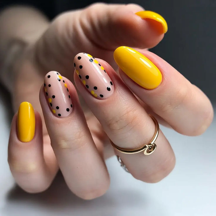 Glossy mustard yellow nails are balanced with nude accent nails featuring scattered black and yellow polka dots. The contrast gives it a bold yet minimal summer aesthetic.