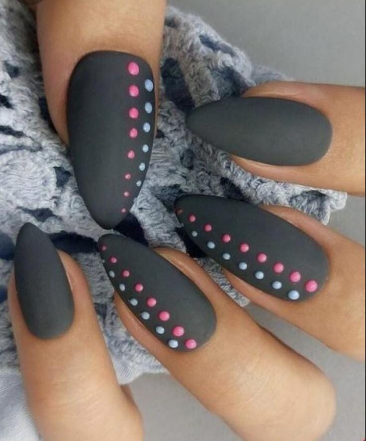 Matte charcoal nails are accented with neat rows of pastel polka dots for a sleek, modern look. The design feels edgy yet soft, perfect for a subtle summer statement.