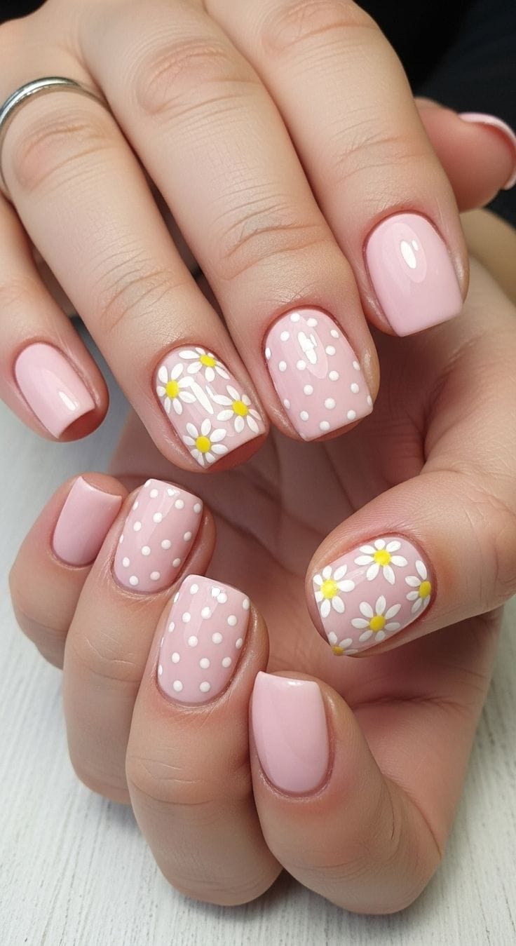 Soft blush pink nails are paired with white polka dots and delicate daisy accents for a cute, feminine feel. The overall style is fresh, simple, and perfect for a sunny summer day.